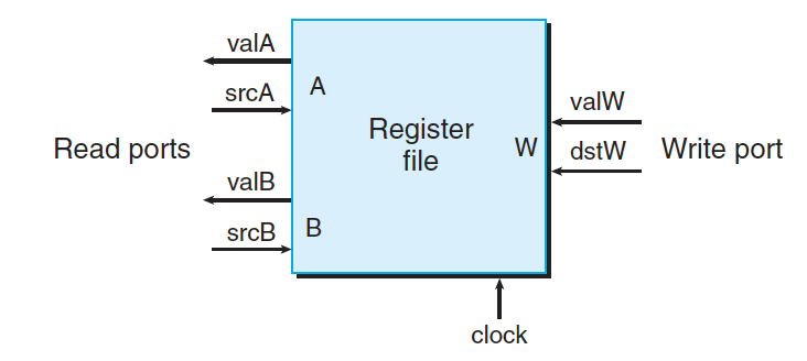 레지스터 파일은 내부 저장소가 있기 때문에 조합 회로가 아니다. 그러나 우리의 구현체에서는 데이터가 마치 주소 input과 데이터 output을 가지는 조합 논리의 블록이라서 데이터가 레지스터 파일로 부터 읽을 수 있다.