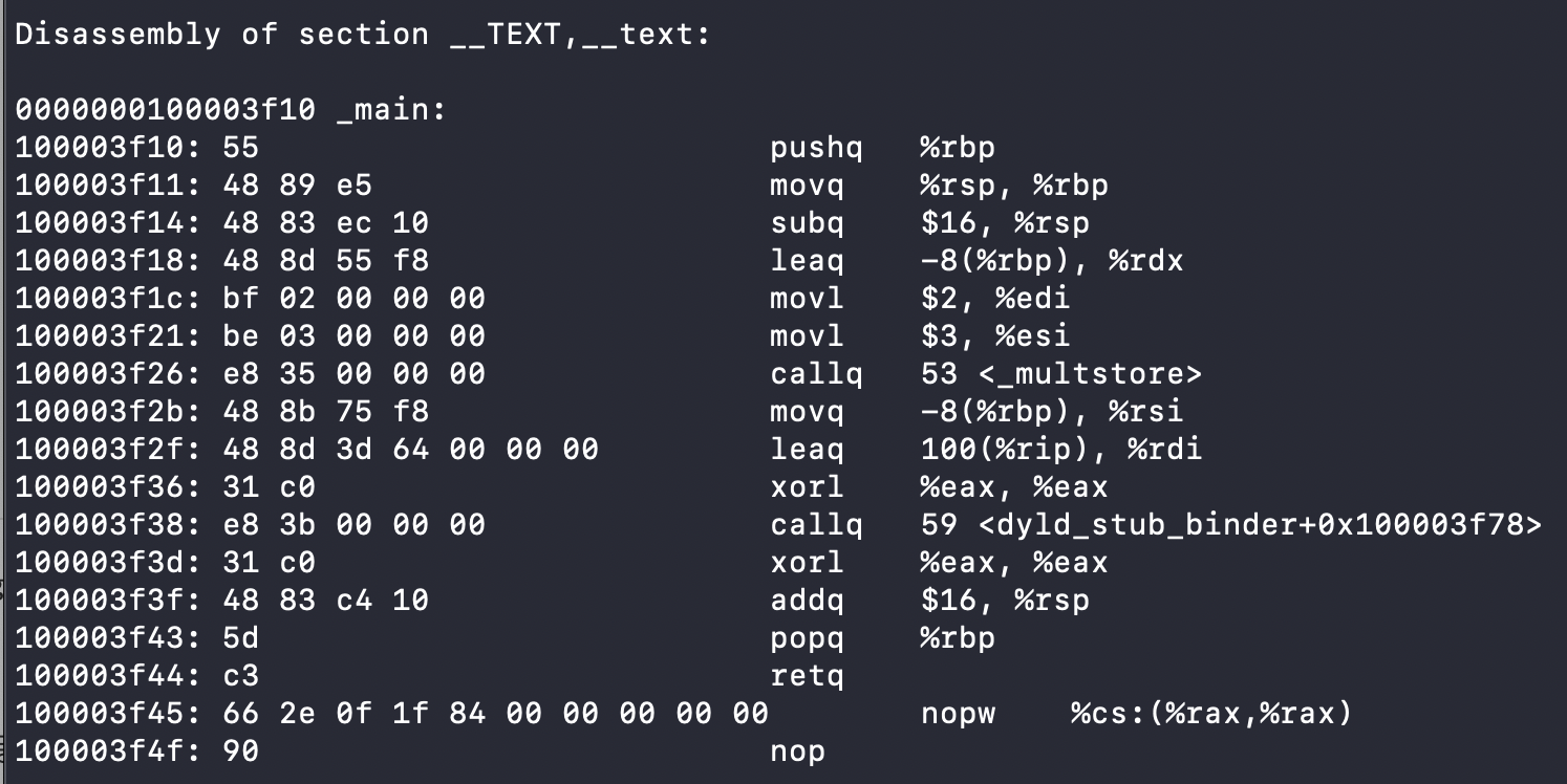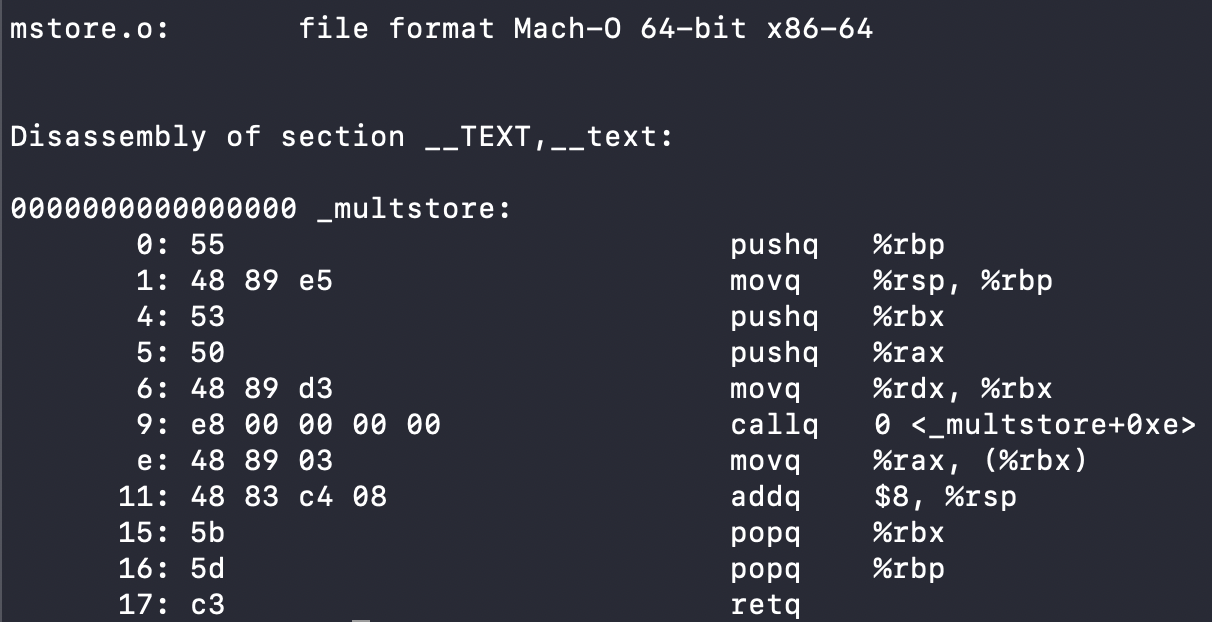 이는 이진 형태의 오브젝트 파일 mstore.o를 생성하여 직접적으로 보지는 못한다.